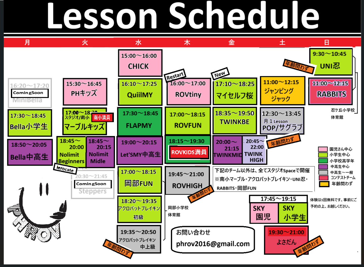 - 4月から、レッスンスケジュールが変更しておりますので、ご確認ください
